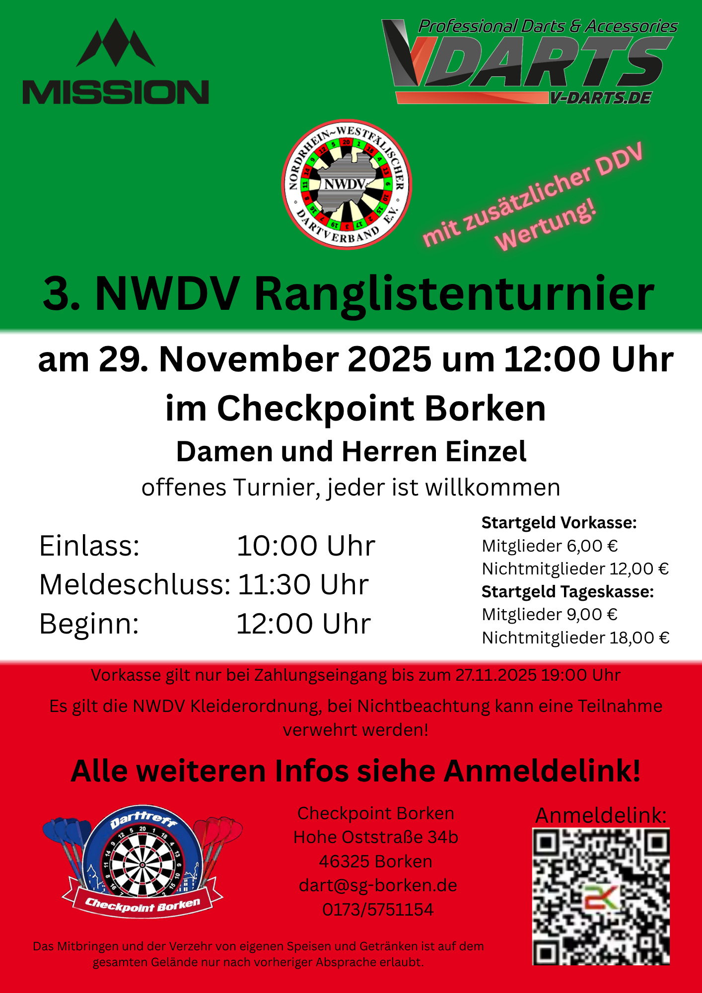 Startgeld für NWDV Mitglieder: 6,-€ bei Vorkasse bis Donnerstag 27.11.25 um 19:00 Uhr.